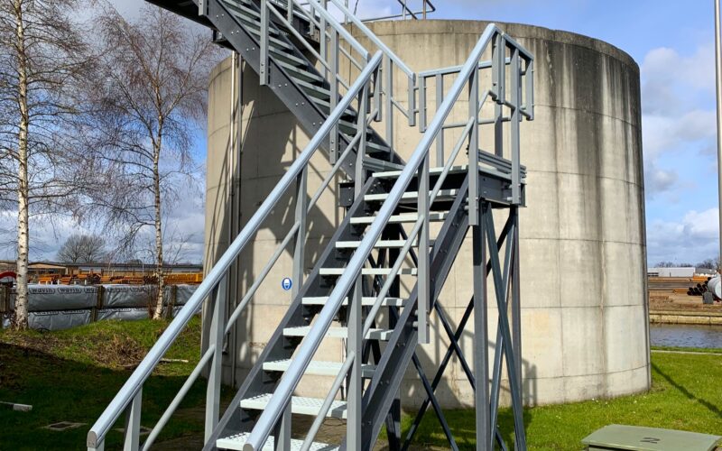 Na opdrachtverstrekking zijn de trappen volledig op maat gemaakt, geproduceerd, geassembleerd en volledig gemonteerd op locatie. Het resultaat is een veilige, duurzame en onderhoudsarme toegang tot de buitentankopslag.
